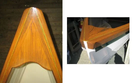 But here’s the big surprise; I do a lot of delicate woodwork with it. Delicate woodwork? Once you get the knack of using the small grinder you can do amazing things with it. The art of marrying woodwork with a fiberglass hull requires that you often have to make some adjustments to the shape of each of those two materials that goes well outside the boundaries of conventional wood boat building. The Gunning Dory breast hook is an example of where this is done. The small grinder does a lot of the fine shaping that makes the final fit between the teak inwhales and the fiberglass hull, and also the teak breast hook and the inwhales. Why use this tool instead of a fine chisel or plane? Well why not? With the right touch this grinder can do the most delicate of tasks, and it’s hard to argue with the results seen on the next slide: