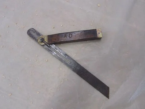 This wonderful, cherished tool is one of the oldest in the boat shop. I found it jumbled in with a mess of tools in an old wood tool box in the cellar. I believe the wood is rosewood, the end pieces brass and the blade is iron. To my great delight I found the initials “A D” carved into the handle, and it also holds a place of high honor in the shop as it belonged to my maternal grandfather Adrian Joseph Dugas. It is likely that he brought it to this country when he moved here just after the First World War.